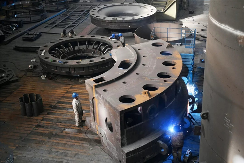 ↑哈電電機(jī)工人在進(jìn)行水輪機(jī)頂蓋的焊接生產(chǎn)(新華社記者王建威9月2日攝)。