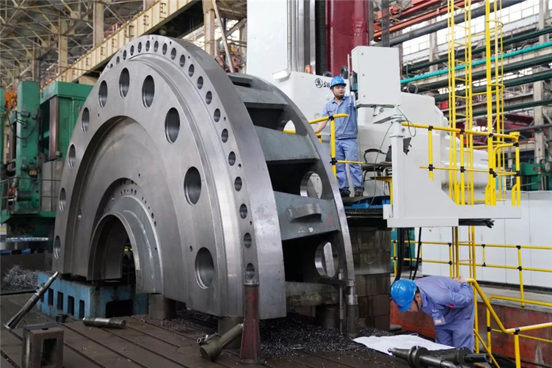 ↑哈電電機(jī)工人在18米臥車上加工白鶴灘百萬(wàn)千瓦水電機(jī)組主軸(新華社記者王建威9月2日攝)。