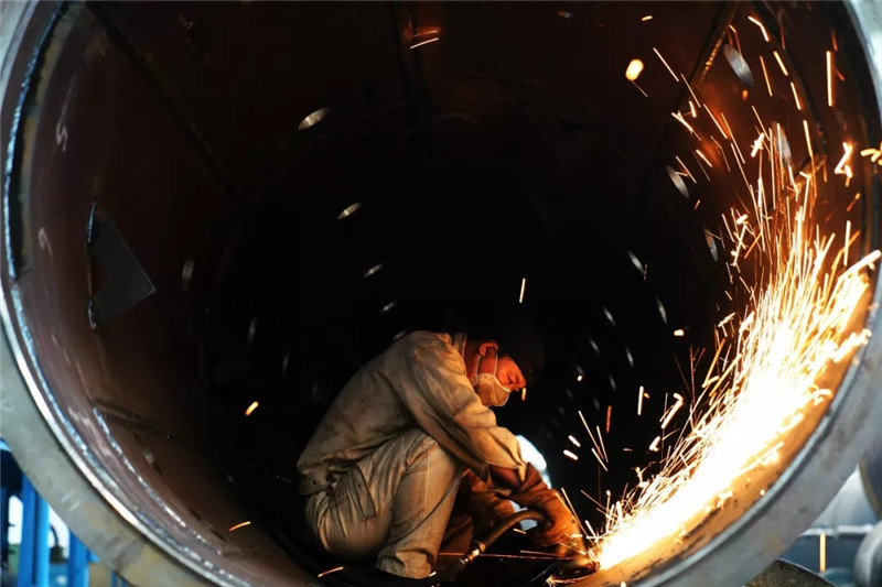 ↑在哈電鍋爐廠房?jī)?nèi),工人在進(jìn)行生產(chǎn)作業(yè)(新華社記者王建威9月4日攝)。
