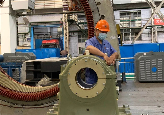 哈電集團動裝公司電機制造部黨員于海蛟正在進行中信重工軸承座拆裝工序。