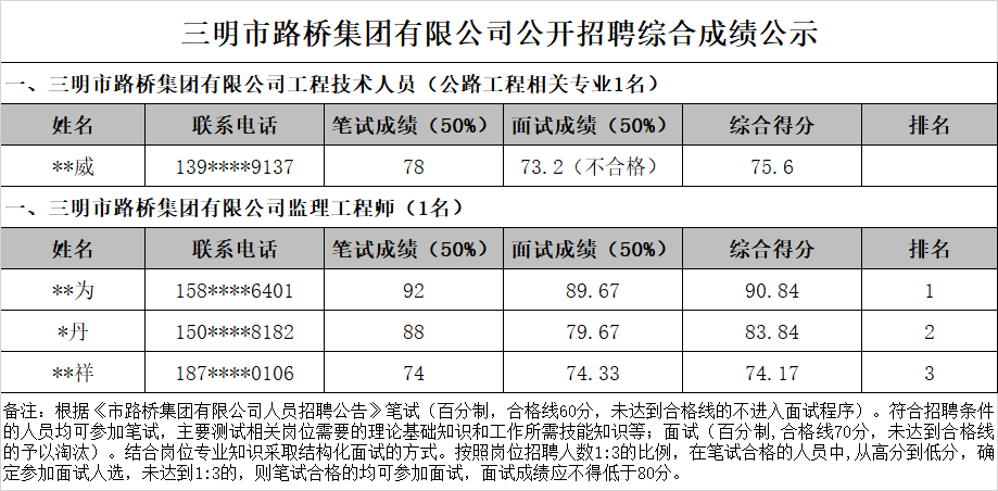 根據(jù)《市路橋集團(tuán)有限公司人員招聘公告》,現(xiàn)將市路橋集團(tuán)有限公司公開招聘工作人員綜合成績(jī)及排名情況公示如下: