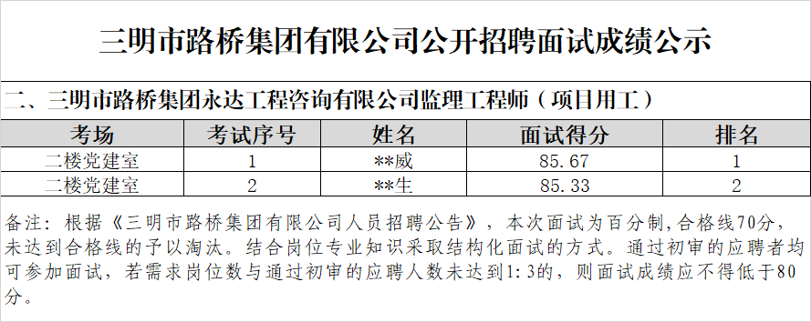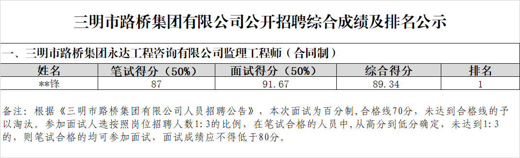 根據(jù)《三明市路橋集團(tuán)有限公司人員招聘公告》,現(xiàn)將市路橋集團(tuán)有限公司公開招聘工作人員綜合成績及排名情況公示如下: